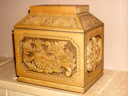 Шкатулка резная «Пряха». Высота 20 см. Мастер А. Я. Колов. 1997 г.