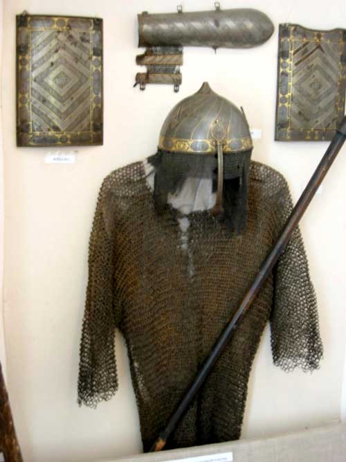 Доспехи являются настоящим украшением зала оружия. У них прекрасная сохранность. Время изготовления можно определить по дате, выгравированной арабскими цифрами на шлеме поперёк основного рисунка – 934 год хиджры. В переводе на европейский календарь даёт это 1556. У шлема имеются отверстия для декоративных перьев, кольчужная сетка-бармица, закрывавшая шею и лицо, подвижный наносник. Для надежной защиты воина поверх кольчуги надевались панцирные доски – на грудь, на спину, на бока. Их называли «зерцала», т.к. они блестели на солнце как зеркала. Налокотник надевался на правую руку, наиболее подверженную ударам противника. В набор входят также пернач (ударное оружие с железными перьями на конце) и богато украшенный круглый щит.