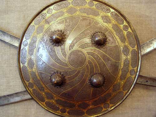 О месте их изготовления можно судить по надписям, выгравированным на шлеме восточной вязью. Кроме того, доспехи украшают гравированные рисунки птиц, зверей, всадников – видимо, оружие изготовлено в Персии (Иране). По канонам ислама художникам запрещено изображать людей или животных, и позволяли себе это только персидские мастера.